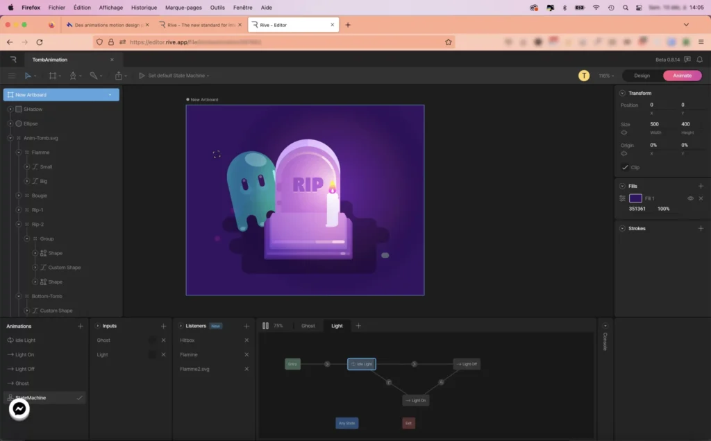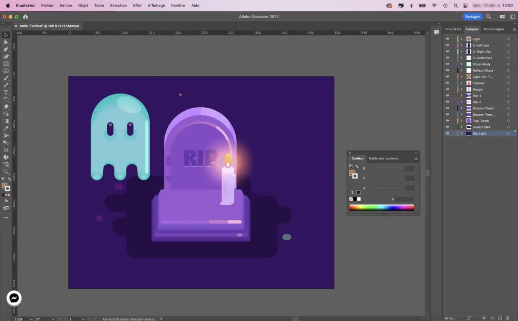 Je commence donc par créer une petite illustration sur Illustrator sur le thème d’Halloween puis importe le fichier sur Rive.app